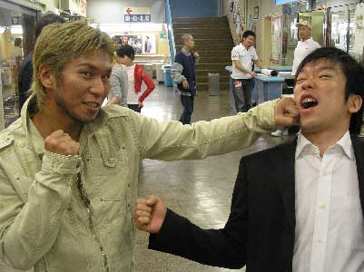 なわけはもちろんありません!この写真で市川にパンチを打ち込んで(いるように見せている)のは、“微笑のタフガイ”ことサトル・ヴァシコバ選手。実況デビュー以来、矢野ボスと共に番組を担当させていただいている「全日本キックボクシング」で活躍中のキックボクサーなのです。 ヴァシコバ選手と出会ったの「新空手」の会場、3年以上前のことになります。 当時、新空手の大会では本名の「小林悟」、そしてプロのリングネームは「サトル・ヴァシコバ」と使い分けていたのですが、理由は、全日本キックのエース格で世界王者の小林聡選手と一文字違いのため、はっきり区別させたかったのだとか。一見して「変わった名前だな〜」と思われ、そしてそのおかげで覚えられる。プロの確固たる主張が生み出した効果です(笑)上の写真は4月17日、ヴァシコバ選手の記念すべき番組での初解説を祝して撮らせてもらいました。 普段はけっして笑顔を絶やさず、しかし一旦勝負となればガンガン打ち合い、必殺の左ストレートで対戦相手を倒す姿に毎度興奮させられております。とにかく、真っ向勝負のどつきあいを見たい格闘技ファンの皆様、「全日本キックボクシング」およびヴァシコバ選手に要・注目!です!! |
