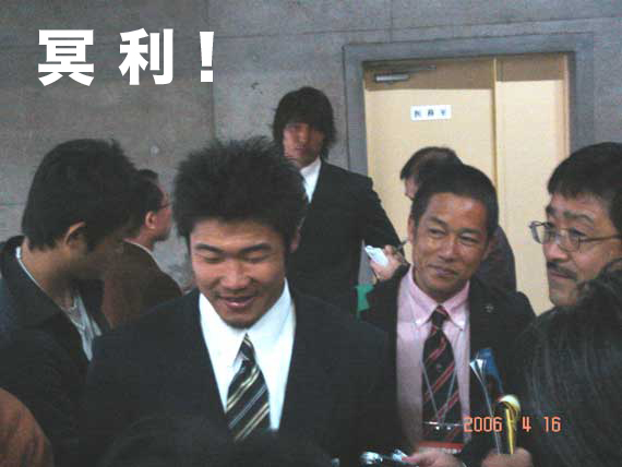 記者の囲み取材に応じる今村選手の背後にもまたアノ男性が?日に焼けた顔に大きな瞳!