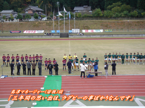福井県はラグビー不毛の地といわれ予選参加校は僅かに三校、、、。 しかしここ小浜市は両校の地元、さらに山口良治(スクールウォーズの泣き虫先生のモデル)さん や、日本代表でワールドカップにも二度出場した朽木英次さんの故郷という事もあり、 ラグビー熱は高い土地なんです。 前日に小浜入りして練習も取材、両校の決戦へ向けた決意表明の瞬間にも立ち会えました。 若狭東高校の奥井主将 「俺はお前達を絶対に花園へ連れてゆく!お前達も俺を連れて行ってくれ!」 若狭高校の朽木監督 「14年間の監督歴の中で最強のチームではない、でも最高のチームだ!」 若狭高校の佐久間主将 「明日!最高のチームで最高のゲームをしょう!」 |
